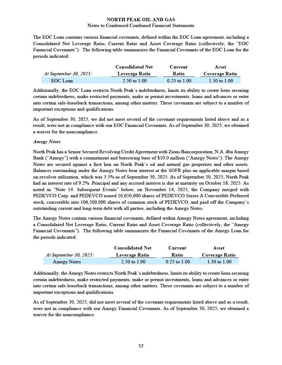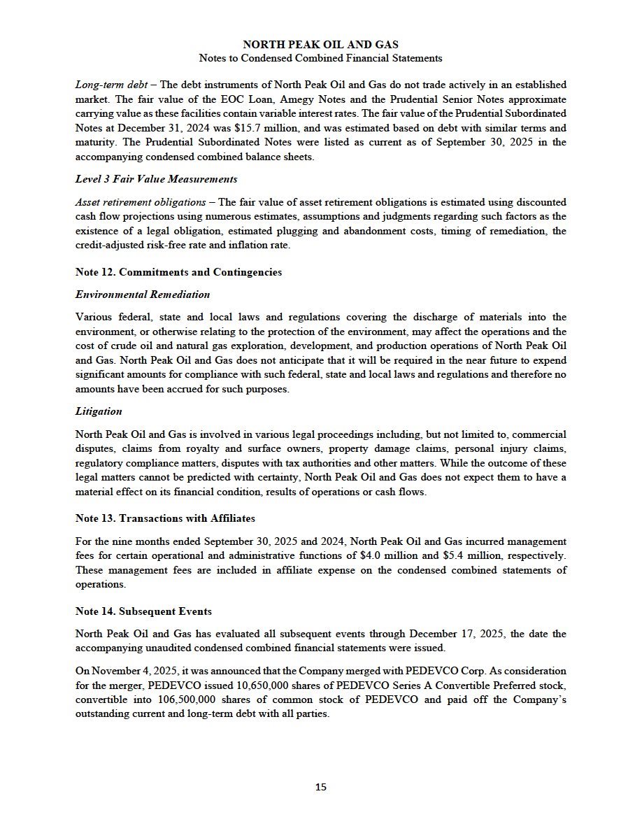 Pursuant to the Merger Agreement, at the effective time, (a) First Merger Sub merged with and into NPOG, with NPOG being the surviving entity and a wholly owned subsidiary of PEDEVCO and (b) Second Merger Sub merged with and into COG, with COG being the surviving entity and a wholly owned subsidiary of PEDEVCO (clauses (a) and (b), together, the “Mergers”). North Peak owns substantial oil-weighted producing assets and leasehold interests with future drilling inventory located in the Northern DJ and Powder River Basins including approximately 281,000 net acres (“North Peak Merger”). The North Peak Merger closed on October 31, 2025.