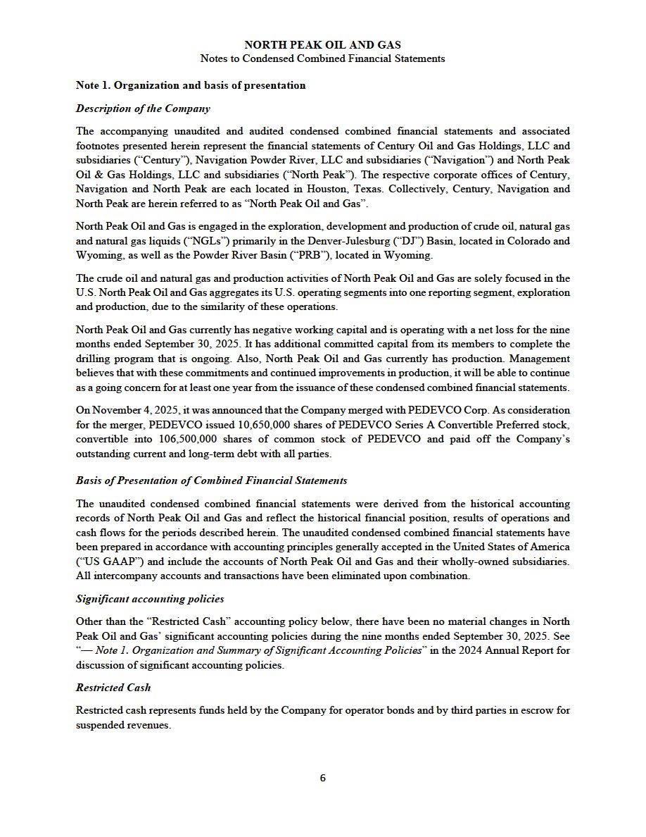 The Unaudited Pro Forma Condensed Combined Balance Sheet as of September 30, 2025 gives effect to the North Peak Merger as if it had been completed on September 30, 2025. The Unaudited Pro Forma Condensed Combined Statements of Operations for the nine months ended September 30, 2025 and the year ended December 31, 2024 gives effect to the North Peak Merger as if it had been completed on January 1, 2024. The unaudited pro forma condensed combined financial information has been compiled in a manner consistent with the accounting policies adopted by PEDEVCO. These pro forma adjustments are described in more detail in the accompanying notes to the unaudited pro forma condensed combined financial information. Additional assumptions and estimates underlying the pro forma adjustments are also described in the accompanying notes, which should be read in conjunction with the unaudited pro forma condensed combined financial information.